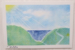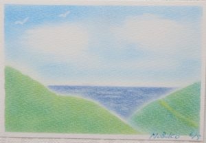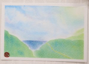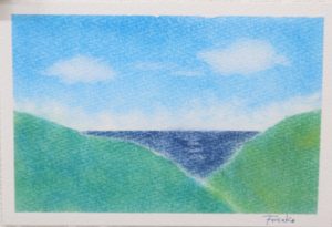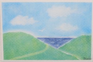 海の描き方は何パターンかありますが、砂浜の広がる海ではなく、山の間から臨む海の風景が青森県らしいな…ということで、今回はこちらの絵を選びました。