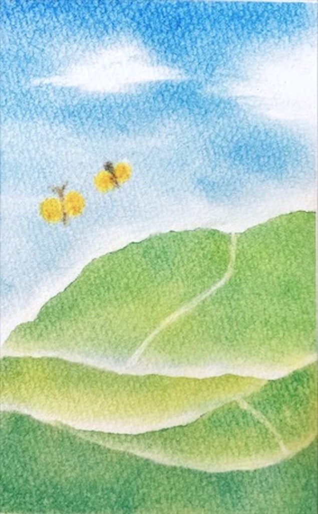 谷と山が描けたら空を塗って、空には自由にパーツを描き入れて完成です!