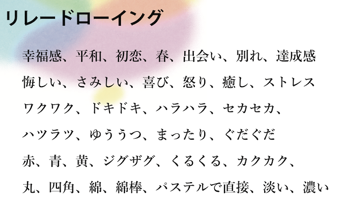 リレードローイングは、本来は対面のワークショップ等で、その名のとおり“リレー”形式で進めるものですが、今回はオンライン開催ということで、描く“お題”をリレー形式で出していく方法で進めました。
