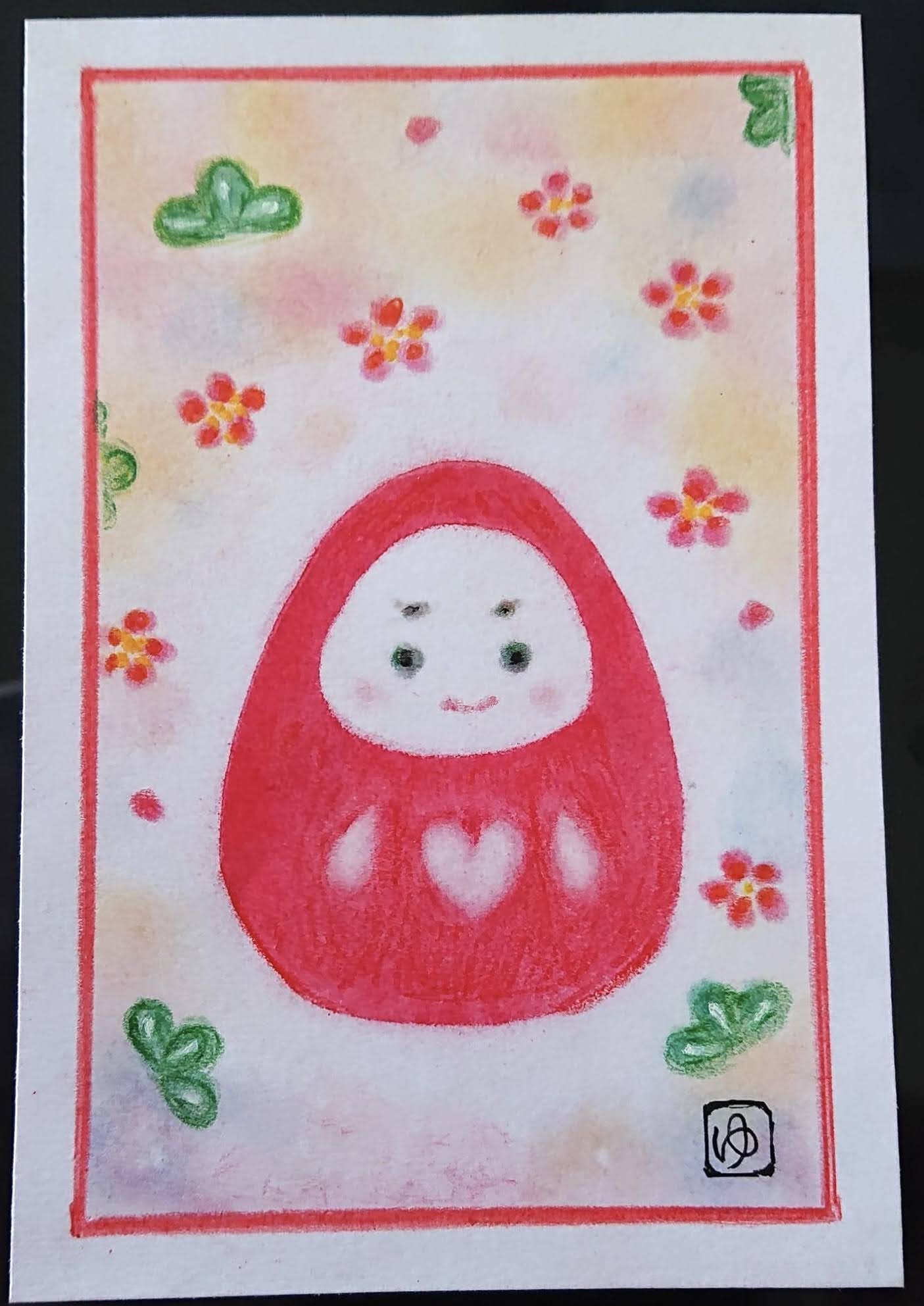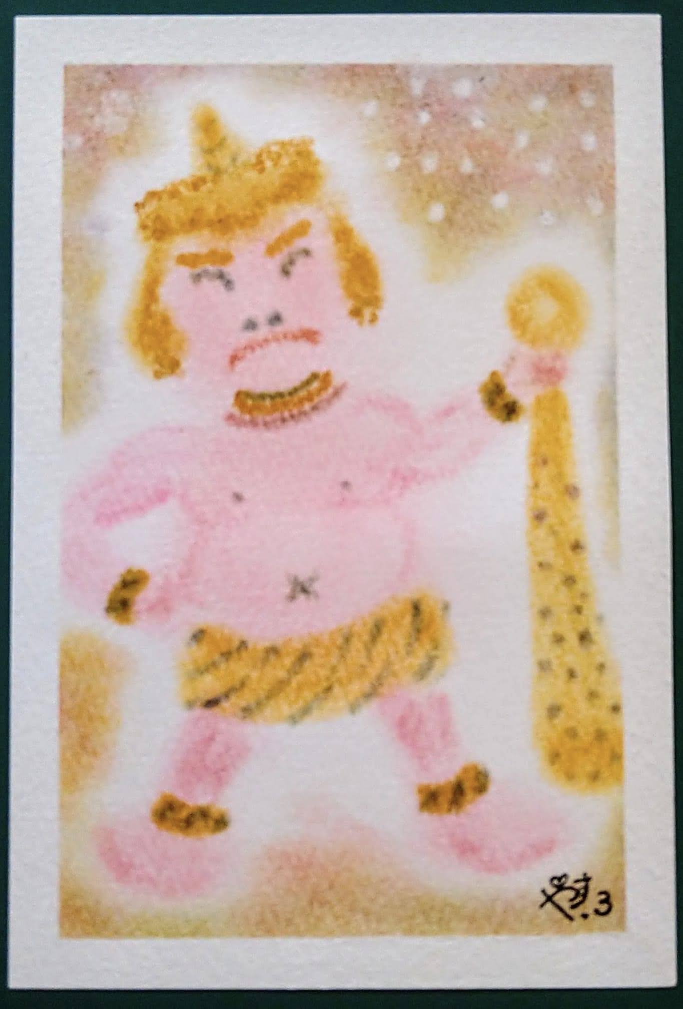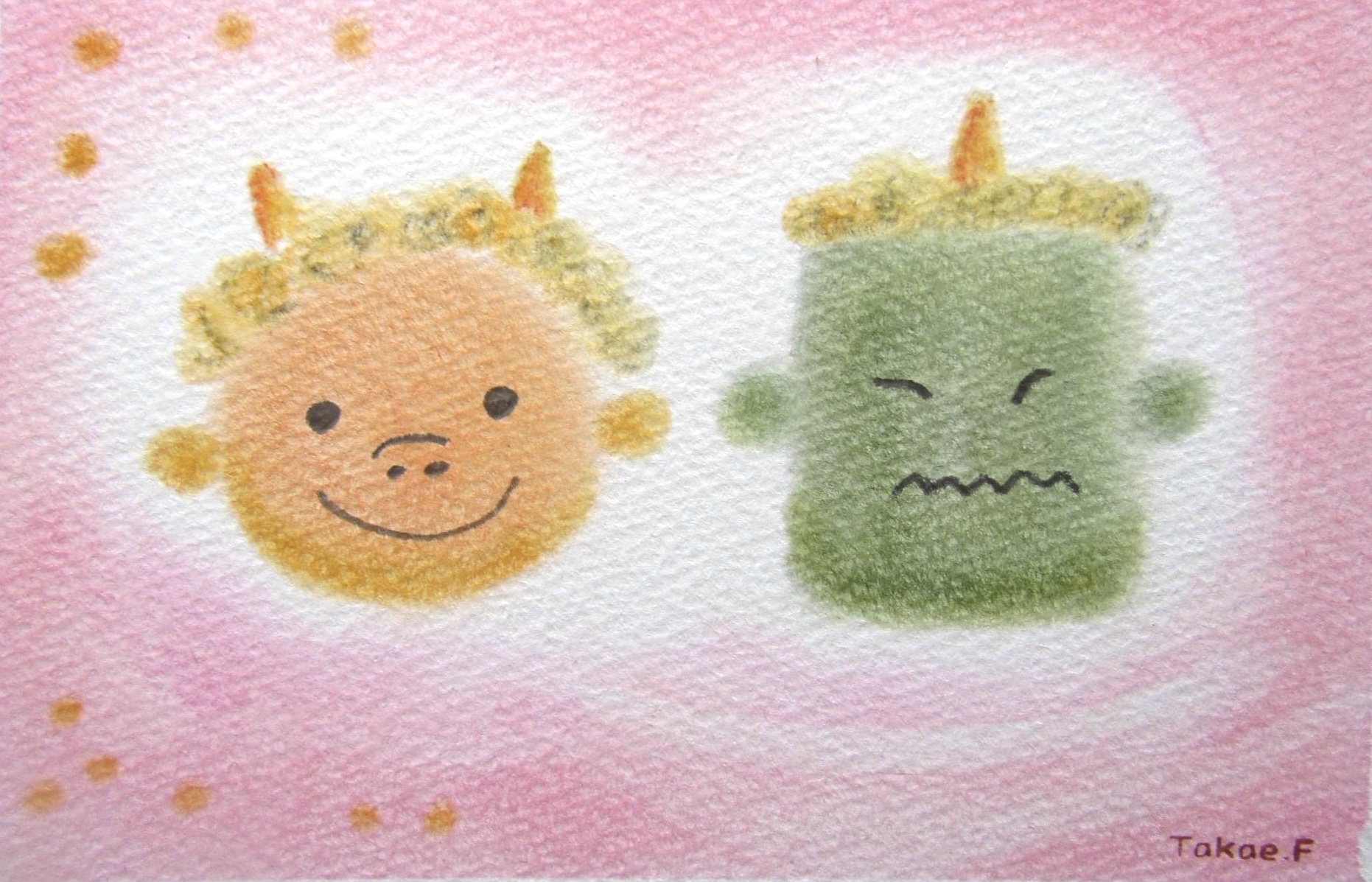 ↑節分にぴったりの『鬼』。こんな鬼なら怖くないかも。。周りの黄色いドットはお豆のイメージ。年の数だけ描いています。