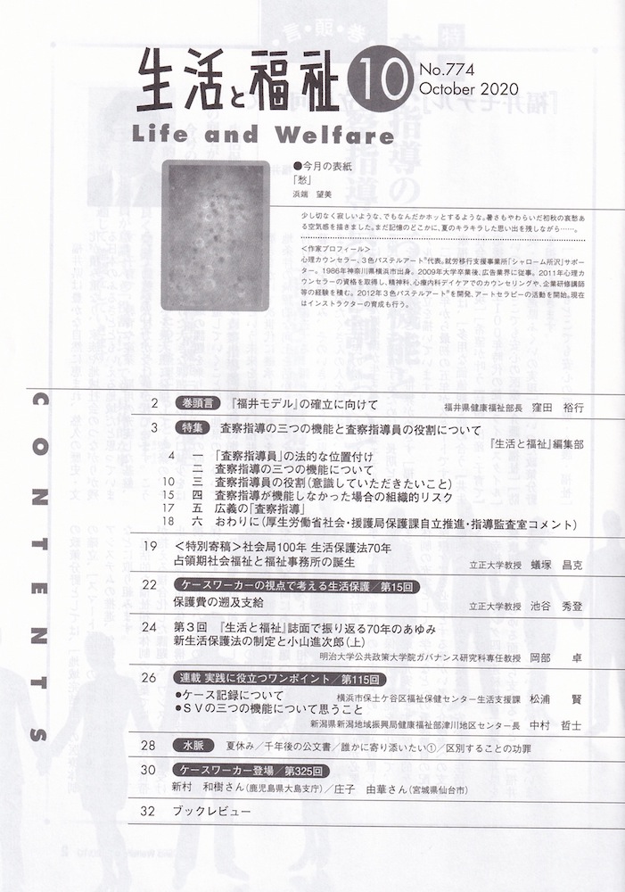 社会福祉法人全国社会福祉協議会より発行の月刊誌『生活と福祉』(2020年10月号)第774号に、代表の浜端望美が3色パステルアートで描いた作品が掲載されています。