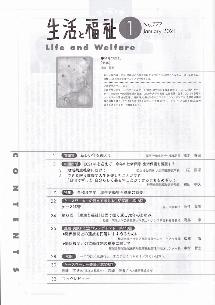 社会福祉法人全国社会福祉協議会より発行の月刊誌『生活と福祉』(2021年1月号)第777号に、代表の浜端望美が3色パステルアートで描いた作品が掲載されています。