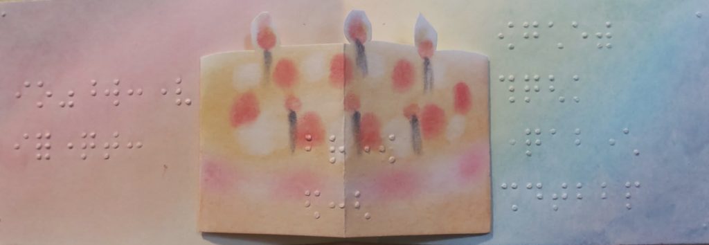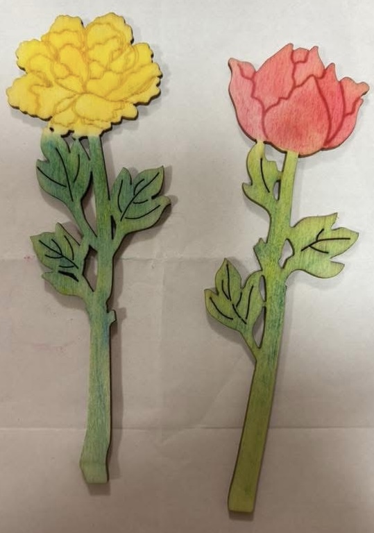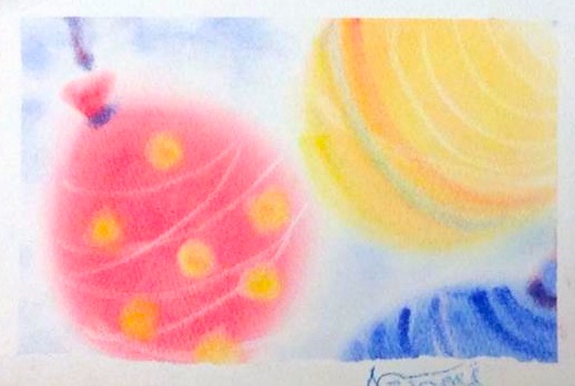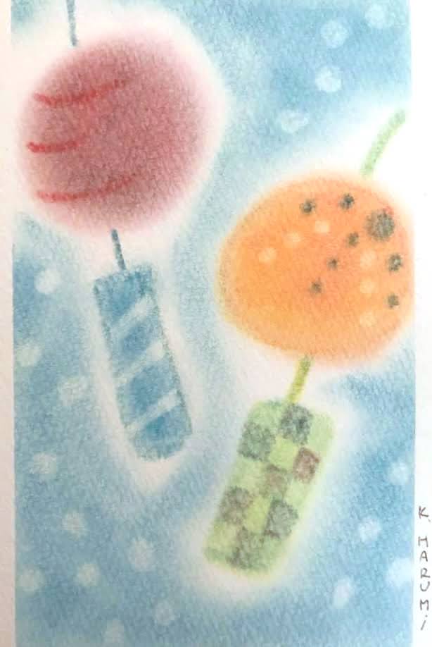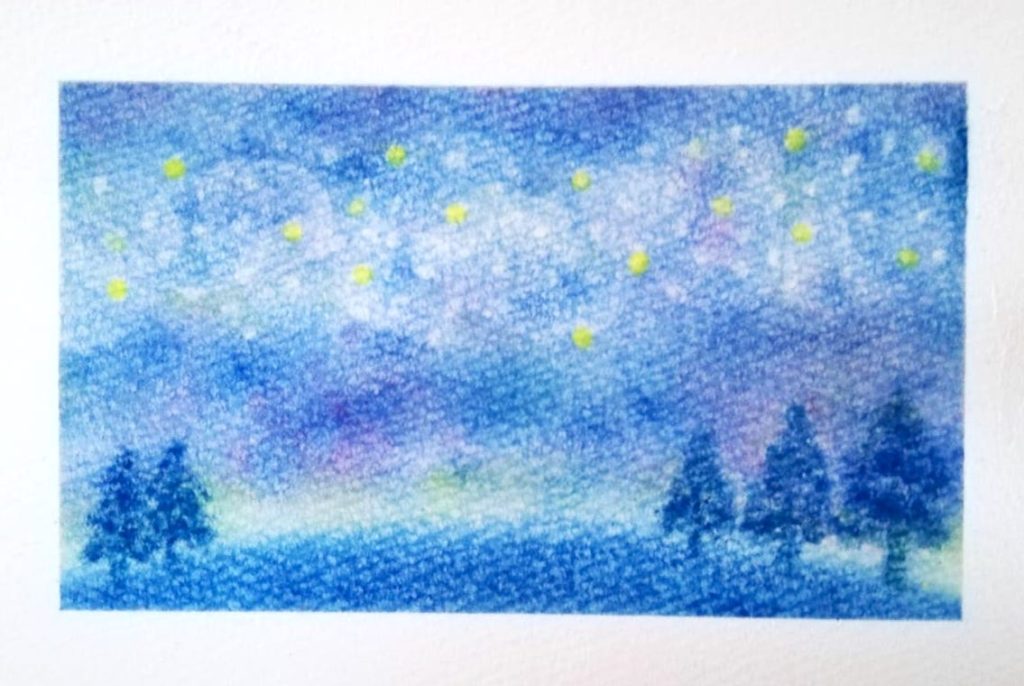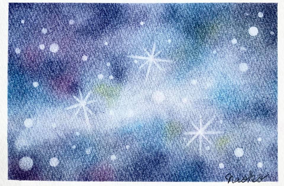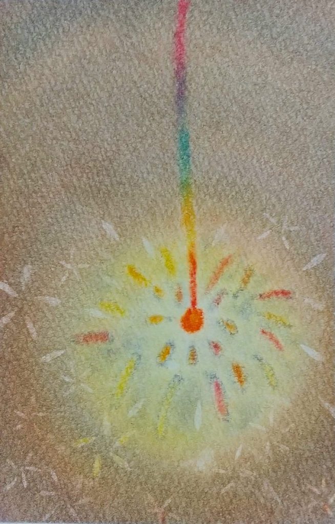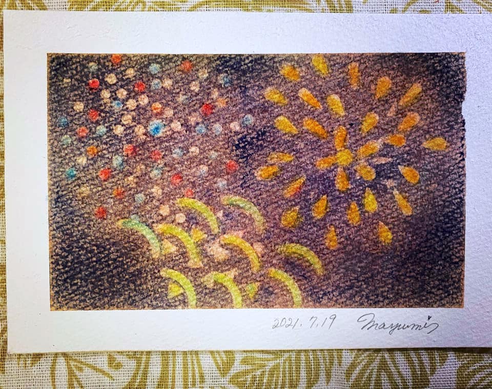 カラフルな花火が夜の街を照らします。この作品は画用紙いっぱいにランダムに3色のパステルを乗せた上から群青色を塗り、それを消しゴムで消すことで描いています。不思議な色合いが浮かび上がり、ワクワクしながら描ける作品です。