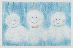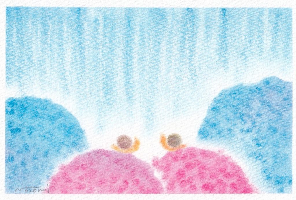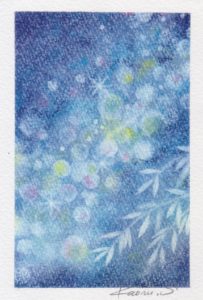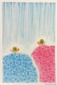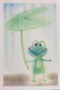 梅雨の訪れを楽しみに待っていたように、葉っぱをいっぱいに広げて雨を受け止める様子を描いた作品です。
